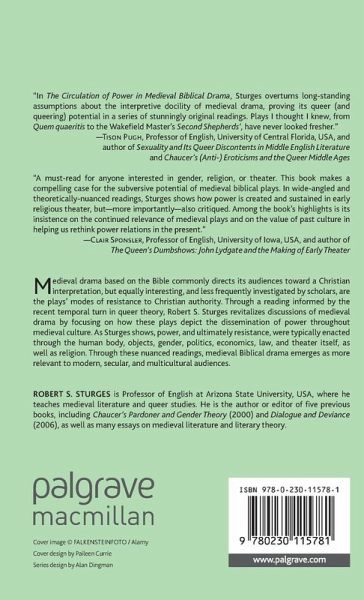 "In The Circulation of Power in Medieval Biblical Drama, Robert S. Sturges overturns longstanding assumptions about the interpretive docility of medieval drama, proving its queer (and queering) potential in a series of stunningly original readings. Plays I thought I knew, from Quem quaeritis to the Wakefield Master's Second Shepherds', have never looked fresher." - Tison Pugh, Professor of English, University of Central Florida, USA, and author of Sexuality and Its Queer Discontents in Middle English Literature and Chaucer's (Anti-) Eroticisms and the Queer Middle Ages