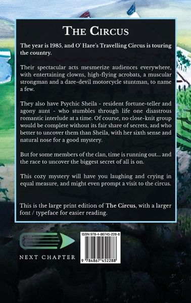 The year is 1985, and O' Hare's Travelling Circus is touring the country. Their spectacular acts mesmerize audiences everywhere, with entertaining clowns, high-flying acrobats, a muscular strongman and a dare-devil motorcycle stuntman, to name a few. They also have Psychic Sheila - resident fortune-teller and agony aunt - who stumbles through life one disastrous romantic interlude at a time. Of course, no close-knit group would be complete without its fair share of secrets, and who better to uncover them than Sheila, with her sixth sense and natural nose for a good mystery. But for some members of the clan, time is running out... and the race to uncover the biggest secret of all is on. This cozy mystery will have you laughing and crying in equal measure, and might even prompt a visit to the circus. This is the large print edition of The Circus, with a larger font / typeface for easier reading.