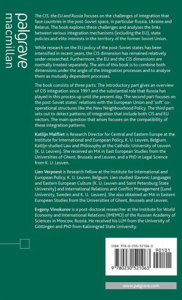 Introduction PART I: IN PURSUIT OF INTEGRATION IN THE POST-SOVIET SPACE The Post-Soviet Space: From the USSR to the Commonwealth of Independent States and Beyond; I.Kobrinskaya Russian Approaches to Integration in the Post-Soviet Space in the 2000s; E.Vinokurov Russia's Pursuit of its Eurasian Security Interests: Weighing the CIS and Alternative Bilateral-Multilateral Arrangements; J.Willerton & M.Beznosov PART II: THE EU AND THE POST-SOVIET SPACE The Clash of Integration Processes? The Shadow Effect of the Enlarged EU on its Eastern Neighbours; T.Casier EU Policies towards Russia: Secondary Integration by Association?; H.Moroff EU- Russia Relations in EU Neighbourhood Policies; M.Vahl PART III: PATTERNS OF INTEGRATION Parallels and Divergences of Integration in Ukraine and Belarus; L.Verpoest Patterns of Integration and Regime Compatibility: Ukraine between the CIS and the EU; R.Dragneva & A.Dimitrova Integration by Absorption: New Subjects for the Russian Federation; G.Kurdiukov & K.Malfliet The EU-Russia Common Economic Space and the Policy-Taker Problem; E.Vinokurov Conclusion: Challenges of Integration: the EU, the CIS and Russia