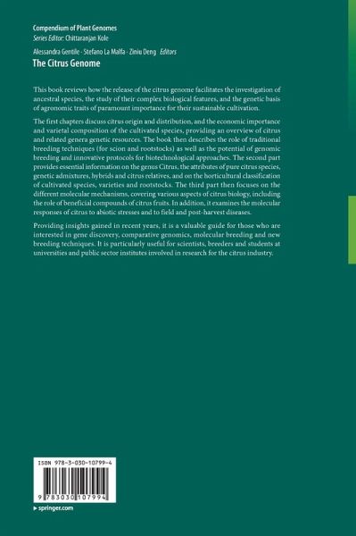 This book reviews how the release of the citrus genome facilitates the investigation of ancestral species, the study of their complex biological features, and the genetic basis of agronomic traits of paramount importance for their sustainable cultivation. The first chapters discuss citrus origin and distribution, and the economic importance and varietal composition of the cultivated species, providing an overview of citrus and related genera genetic resources. The book then describes the role of traditional breeding techniques (for scion and rootstocks) as well as the potential of genomic breeding and innovative protocols for biotechnological approaches. The second part provides essential information on the genus Citrus, the attributes of pure citrus species, genetic admixtures, hybrids and citrus relatives, and on the horticultural classification of cultivated species, varieties and rootstocks. The third part then focuses on the different molecular mechanisms, covering various aspects of citrus biology, including the role of beneficial compounds of citrus fruits. In addition, it examines the molecular responses of citrus to abiotic stresses and to field and post-harvest diseases. Providing insights gained in recent years, it is a valuable guide for those who are interested in gene discovery, comparative genomics, molecular breeding and new breeding techniques. It is particularly useful for scientists, breeders and students at universities and public sector institutes involved in research for the citrus industry.