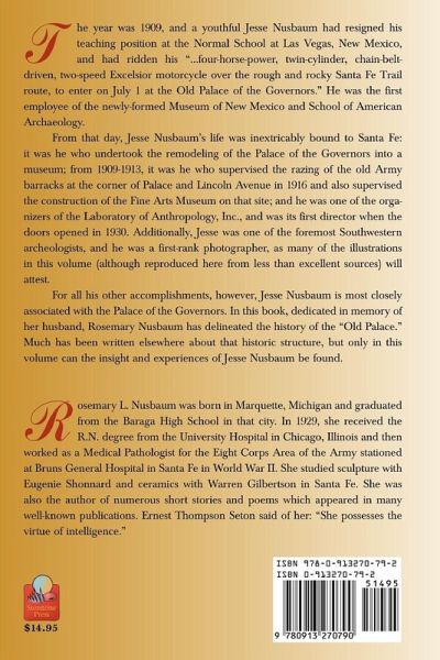 The year was 1909, and a youthful Jesse Nusbaum had resigned his teaching position at the Normal School at Las Vegas, New Mexico, and had ridden his ".four-horse-power, twin-cylinder, chain-belt-driven, two-speed Excelsior motorcycle over the rough and rocky Santa Fe Trail route, to enter on July 1 at the Old Palace of the Governors." He was the first employee of the newly-formed Museum of New Mexico and School of American Archaeology. From that day, Jesse Nusbaum's life was inextricably bound to Santa Fe: it was he who undertook the remodeling of the Palace of the Governors into a museum; from 1909-1913, it was he who supervised the razing of the old Army barracks at the corner of Palace and Lincoln Avenue I 1916 and also supervised the construction of the Fine Arts Museum on that site; and he was one of the organizers of the Laboratory of Anthropology, Inc., and was its first director when the doors opened in 1930. Additionally, Jesse was one of the foremost Southwestern archeologists, and he was a first-rank photographer, as many of the illustrations in this volume (although reproduced here from less than excellent sources) will attest. For all his other accomplishments, however, Jesse Nusbaum is most closely associated with the Palace of the Governors. In this book, dedicated in memory of her husband, Rosemary Nusbaum has delineated the history of the "Old Palace." Much has been written elsewhere about that historic structure, but only in this volume can the insight and experiences of Jesse Nusbaum be found. Rosemary L. Nusbaum was born in Marquette, Michigan and graduated from the Baraga High School in that city. In 1929, she received the R.N. degree from the University Hospital in Chicago, Illinois and then worked as a Medical Pathologist for the Eight Corps Area of the Army stationed at Bruns General Hospital in Santa Fe in World War II. She studied sculpture with Eugenie Shonnard and ceramics with Warren Gilbertson in Santa Fe. She was also the author of numerous short stories and poems which appeared in many well-known publications. Ernest Thompson Seton said of her: "She possesses the virtue of intelligence."