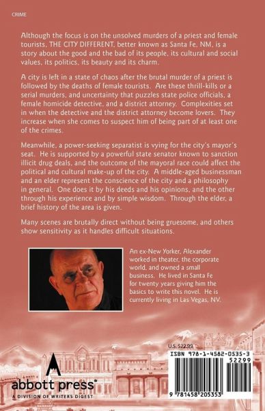 Although the focus is on the unsolved murders of a priest and female tourists, THE CITY DIFFERENT, better known as Santa Fe, NM, is a story about the good and the bad of its people, its cultural and social values, its politics, its beauty and its charm. A city is left in a state of chaos after the brutal murder of a priest is followed by the deaths of female tourists. Are these thrill-kills or a serial murders, and uncertainty that puzzles state police officials, a female homicide detective, and a district attorney. Complexities set in when the detective and the district attorney become lovers. They increase when she comes to suspect him of being part of at least one of the crimes. Meanwhile, a power-seeking separatist is vying for the city's mayor's seat. He is supported by a powerful state senator known to sanction illicit drug deals, and the outcome of the mayoral race could affect the political and cultural make-up of the city. A middle-aged businessman and an elder represent the conscience of the city and a philosophy in general. One does it by his deeds and his opinions, and the other through his experience and by simple wisdom. Through the elder, a brief history of the area is given. Many scenes are brutally direct without being gruesome, and others show sensitivity as it handles difficult situations.