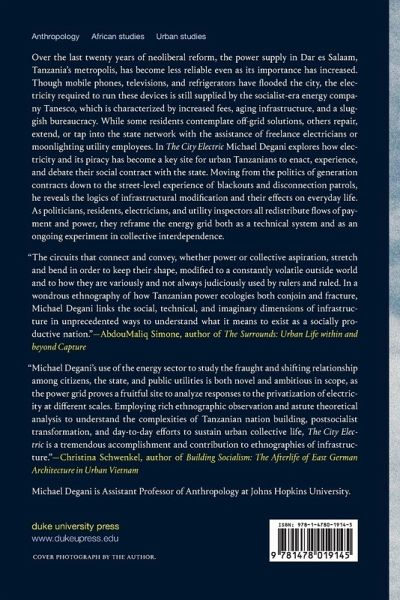 Over the last twenty years of neoliberal reform, the power supply in Dar es Salaam, Tanzania's metropolis, has become less reliable even as its importance has increased. Though mobile phones, televisions, and refrigerators have flooded the city, the electricity required to run these devices is still supplied by the socialist-era energy company Tanesco, which is characterized by increased fees, aging infrastructure, and a sluggish bureaucracy. While some residents contemplate off-grid solutions, others repair, extend, or tap into the state network with the assistance of freelance electricians or moonlighting utility employees. In The City Electric Michael Degani explores how electricity and its piracy has become a key site for urban Tanzanians to enact, experience, and debate their social contract with the state. Moving from the politics of generation contracts down to the street-level experience of blackouts and disconnection patrols, he reveals the logics of infrastructural modification and their effects on everyday life. As politicians, residents, electricians, and utility inspectors all redistribute flows of payment and power, they reframe the energy grid both as a technical system and as an ongoing experiment in collective interdependence.