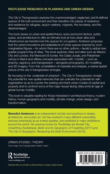 The City in Transgression explores the unacknowledged, neglected, and ill-defined spaces of the built environment and their transition into places of resistance and residence by refugees, asylum seekers, migrants, the homeless, and the disadvantaged. The book draws on urban and spatial theory, socio-economic factors, public space, and architecture to offer an intimate look at how urban sites and infrastructure are transformed into spaces for occupation. Anderson proposes that the varied innovations and adaptations of urban spaces enacted by such marginalized figures - for whom there are no other options - herald a radical new spatial programming of cities. The book explores cities and sites such as Mexico City and London, the Mexican/US border, the Calais Jungle, and Palestinian camps in Beirut and utilizes concepts associated with 'mobility' - such as anarchy, vagrancy, and transgression - alongside photography, 3D modelling, and 2D imagery. From this constellation of materials and analysis, a radical spatial picture of the city in transgression emerges. By focusing on the 'underside of urbanism', The City in Transgression reveals the potential for new spatial networks that can cultivate the potential for self-organization so as to counter the existing dominant urban models of capital and property and to confront some of the major issues facing cities amid an age of global human mobility. This book is valuable reading for those interested in architectural theory, modern history, human geography and mobility, climate change, urban design, and transformation.