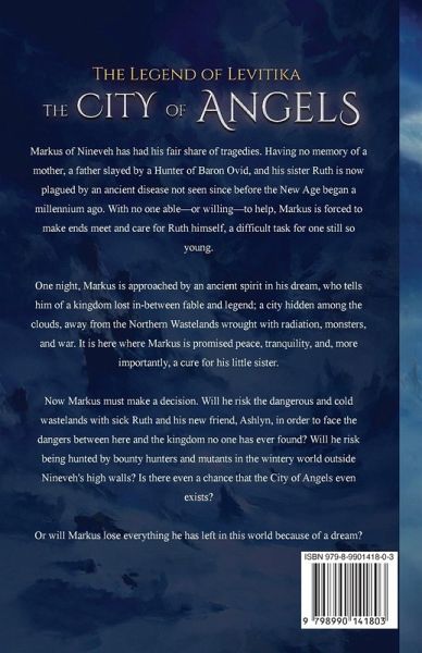 Markus of Nineveh has had his fair share of tragedies. Having no memory of a mother, a father slayed by a Hunter of Baron Ovid, and his sister Ruth is now plagued by an ancient disease not seen since before the New Age began a millennium ago. With no one able-or willing-to help, Markus is forced to make ends meet and care for Ruth himself, a difficult task for one still so young. One night, Markus is approached by an ancient spirit in his dream, who tells him of a kingdom lost in-between fable and legend; a city hidden among the clouds, away from the Northern Wastelands wrought with radiation, monsters, and war. It is here where Markus is promised peace, tranquility, and, more importantly, a cure for his little sister. Now Markus must make a decision. Will he risk the dangerous and cold wastelands with sick Ruth and his new friend, Ashlyn, in order to face the dangers between here and the kingdom no one has ever found? Will he risk being hunted by bounty hunters and mutants in the wintery world outside Nineveh's high walls? Is there even a chance that the City of Angels even exists? Or will Markus lose everything he has left in this world because of a dream?