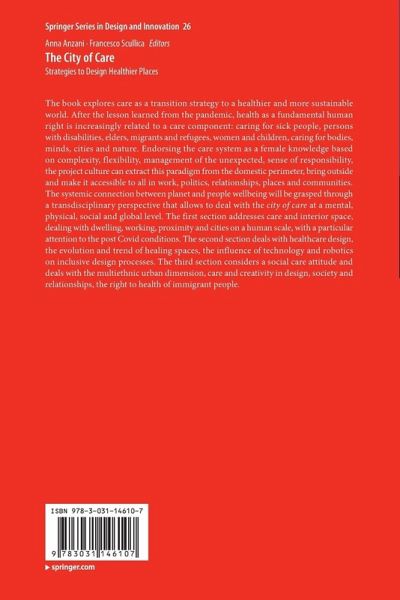The book explores care as a transition strategy to a healthier and more sustainable world. After the lesson learned from the pandemic, health as a fundamental human right is increasingly related to a care component: caring for sick people, persons with disabilities, elders, migrants and refugees, women and children, caring for bodies, minds, cities and nature. Endorsing the care system as a female knowledge based on complexity, flexibility, management of the unexpected, sense of responsibility, the project culture can extract this paradigm from the domestic perimeter, bring outside and make it accessible to all in work, politics, relationships, places and communities. The systemic connection between planet and people wellbeing will be grasped through a transdisciplinary perspective that allows to deal with the city of care at a mental, physical, social and global level. The first section addresses care and interior space, dealing with dwelling, working, proximity and cities on a human scale, with a particular attention to the post Covid conditions. The second section deals with healthcare design, the evolution and trend of healing spaces, the influence of technology and robotics on inclusive design processes. The third section considers a social care attitude and deals with the multiethnic urban dimension, care and creativity in design, society and relationships, the right to health of immigrant people.