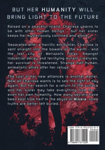 Raised on a peaceful island, Charissa yearns to be with other human beings - but her sister keeps her mysteriously confined and alone. Separated after a horrific encounter, Charissa is sent straight into the bowels of the earth - and the lost city of Metropolis Pietas. Amongst industrial decay and terrifying mutant creatures, her survival is threatened. Strange half-human, animalistic allies offer her refuge. The cost of her new alliances is another matter. Now all Charissa wants is to see the light of day again. But her search for a return to the surface and her sister may take everything from her - even her own humanity. How many secrets have been kept from her? In the abyss of Misera, some truths are better left buried.