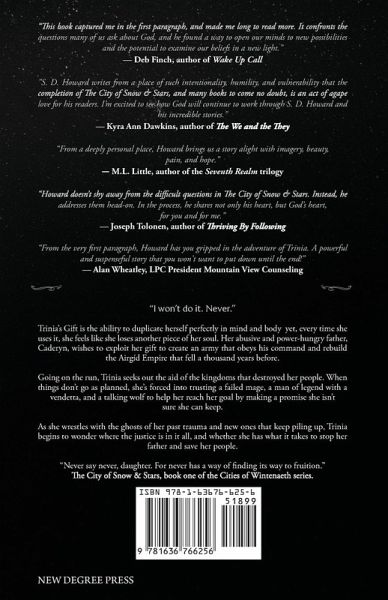 A gritty YA Christian Fantasy tackling difficult topics surrounding abuse, human trafficking, and the question "Why does God let bad things happen?" Trinia's Gift is the ability to duplicate herself perfectly in mind and body yet, every time she uses it, she feels like she loses another piece of her soul. Her abusive and power-hungry father, Caderyn, wishes to exploit her gift to create an army that obeys his command and rebuild the Airgíd Empire that fell a thousand years before. Going on the run, Trinia seeks out the aid of the kingdoms that destroyed her people. When things don't go as planned, she's forced into trusting a failed mage, a man of legend with a vendetta, and a talking wolf to help her reach her goal by making a promise she isn't sure she can keep. As she wrestles with the ghosts of her past trauma and new ones that keep piling up, Trinia begins to wonder where the justice is in it all, and whether she has what it takes to stop her father and save her people. How far would you run to escape your future? -II- Filled with sweeping landscapes, terrifying creatures, and incredible legends, Wintenaeth is a land held together by a fragile peace. After the fall of the Old Airgíd Empire, four kingdoms rose from the ashes and now rule, but the Airgíd are not gone, nor have they forgotten what was done to them. The City of Snow & Stars is book one in the Cities of Wintenaeth Trilogy and the first in a larger story which takes place over the twelve books planned in the series. If you love The Lord of the Rings, The Chronicles of Narnia, or epic fantasy, you'll love this book. Grab your copy and join the growing community of readers! "The City of Snow & Stars is a fast-paced, skillfully crafted story that will leave readers wanting to read the next book in the series." - Romuald Dzemo, Reviewer at Reader's Favorite