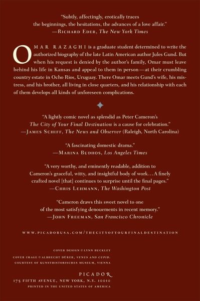 The City of Your Final Destination is a touching, clever and wonderfully comic novel from Peter Cameron, now a major motion picture starring Anthony Hopkins, Laura Linney, and Charlotte Gainsbourg. Omar Razaghi posts a letter on September 13, 1995 that will change the course of his life forever. A doctoral student at the University of Kansas, he writes to the estate of the Latin American author Jules Gund, requesting permission to write Gund's authorized biography. His request is refused, but Omar has already accepted a fellowship from the university, and with his girlfriend's vehement encouragement, he goes in person to Uruguay to petition to Gund's three executors. Although Caroline Gund, Jules' wife, and Arden Langdon, Jules' mistress and mother of his child, are initially opposed to the idea of a biography, Omar has the support of Adam, Jules' older brother, and hopes to be able to persuade the two women. Omar's unexpected arrival in Uruguay reverberates through this odd and isolated little family group, and his stay in the languid, dreamy Ochos Rios makes him question his former life in Kansas, and his ability-even his desire-to write an "authorized" life.