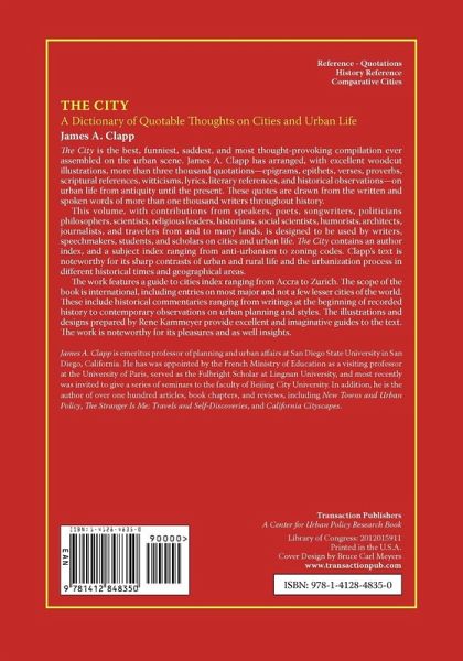 The City is the best, funniest, saddest, and most thought-provoking compilation ever assembled on the urban scene. James A. Clapp has arranged, with excellent woodcut illustrations, more than three thousand quotations - epigrams, epithets, verses, proverbs, scriptural references, witticisms, lyrics, literary references, and historical observations - on urban life from antiquity until the present. These quotes are drawn from the written and spoken words of more than one thousand writers throughout history.This volume, with contributions from speakers, poets, song writers, politicians philosophers, scientists, religious leaders, historians, social scientists, humorists, architects, journalists, and travelers from and to many lands is designed to be used by writers, speechmakers, students, and scholars on cities and urban life. The City contains an author index, and a subject index ranging from anti-urbanism to zoning codes. Clapp's text is noteworthy for its sharp contrasts of urban and rural life and the urbanization process in different historical times and geographical areas.The work features a guide to cities index ranging from Accra to Zurich. The scope of the book is international, including entries on most major and not a few lesser cities of the world. These include historical commentaries ranging from writings at the beginning of recorded history to contemporary observations on urban planning and styles. The illustrations and designs prepared by Rene Kammeyer provide excellent and imaginative guides to the text. The work is noteworthy for its pleasures and as well insights.