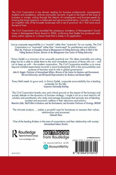The Civil Corporation is top draw reading for business professionals, management students and academics, activists and public servants. It goes to the heart of the issue of business in society, cutting through the rhetoric of campaigners and business-speak by framing the tough questions in balanced and yet provocative terms. Crucially, it connects an insightful vista of the broader landscape with a set of practical 'do's' that have stood the test of time. The book was awarded the prestigious Academy of Management's Social Issues in Management Book Award in 2006, confirming that Zadek has produced what every author aspires to: a classic book that is timely in its application.