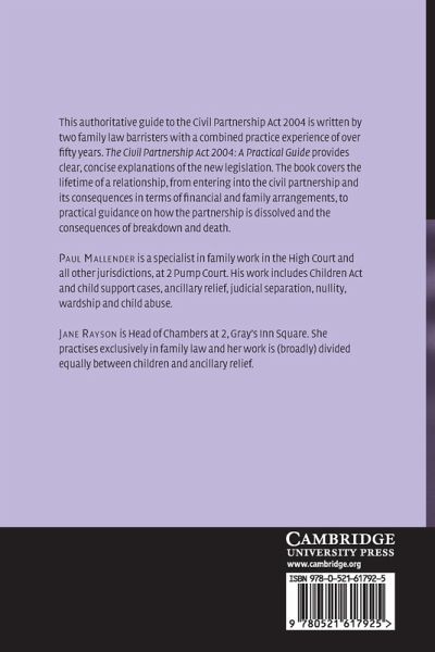 The Civil Partnership Act is a major piece of social legislation and is intended to create an entirely new legal framework for same-sex couples who wish to 'marry'. Written by two family law practitioners with a combined practice experience of over fifty years, The Civil Partnership Act 2004: A Practical Guide provides a clear, concise explanation of the new legislation. The book spans the lifetime of a relationship, from entering into the civil partnership, its consequences in terms of financial and family arrangements, to practical guidance on how the partnership is dissolved and the consequences of breakdown and death.