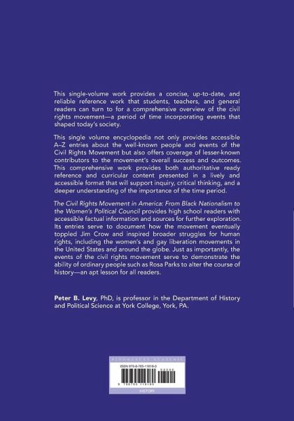 This single-volume work provides a concise, up-to-date, and reliable reference work that students, teachers, and general readers can turn to for a comprehensive overview of the civil rights movement-a period of time incorporating events that shaped today's society. This single volume encyclopedia not only provides accessible A-Z entries about the well-known people and events of the Civil Rights Movement but also offers coverage of lesser-known contributors to the movement's overall success and outcomes. This comprehensive work provides both authoritative ready reference and curricular content presented in a lively and accessible format that will support inquiry, critical thinking, and a deeper understanding of the importance of the time period. The Civil Rights Movement in America: From Black Nationalism to the Women's Political Council provides high school readers with accessible factual information and sources for further exploration. Its entries serve to document how the movement eventually toppled Jim Crow and inspired broader struggles for human rights, including the women's and gay liberation movements in the United States and around the globe. Just as importantly, the events of the civil rights movement serve to demonstrate the ability of ordinary people such as Rosa Parks to alter the course of history-an apt lesson for all readers.
