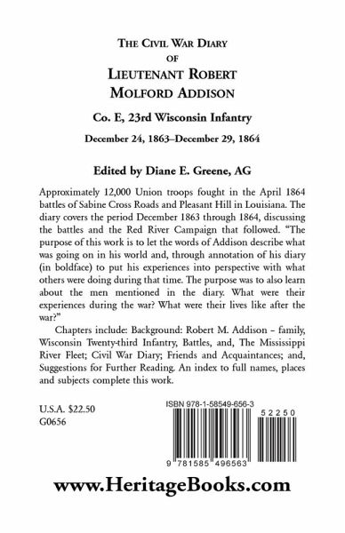 Approximately 12,000 Union troops fought in the April 1864 battles of Sabine Cross Roads and Pleasant Hill in Louisiana. The diary covers the period December 1863 through 1864, discussing the battles and the Red River Campaign that followed. "The purpose of this work is to let the words of Addison describe what was going on in his world and, through annotation of his diary (in boldface) to put his experiences into perspective with what others were doing during that time. The purpose was to also learn about the men mentioned in the diary. What were their experiences during the war? What were their lives like after the war?" Chapters include: Background: Robert M. Addison - family, Wisconsin Twenty-third Infantry, Battles, and, The Mississippi River Fleet; Civil War Diary; Friends and Acquaintances; and, Suggestions for Further Reading. An index to full names, places and subjects complete this work.