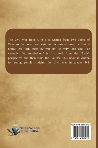 The Civil War from A to Z is written from Two Points of View so that one can begin to understand how the United States was torn apart by war not so very long ago. For example, "A, Antebellum" is first told from the North's perspective and then from the South's. This book is written for young people studying the Civil War in grades 4-8.