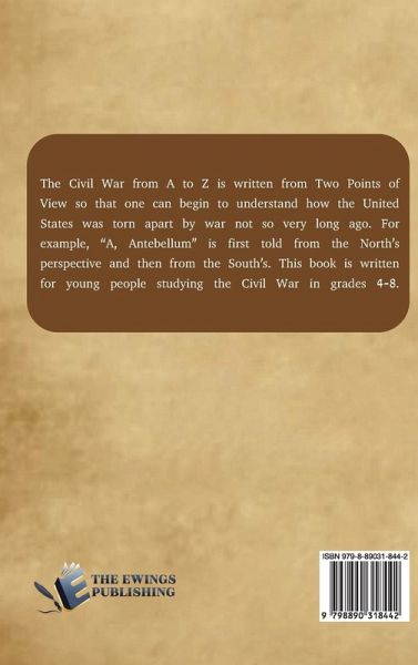 The Civil War from A to Z is written from Two Points of View so that one can begin to understand how the United States was torn apart by war not so very long ago. For example, "A, Antebellum" is first told from the North's perspective and then from the South's. This book is written for young people studying the Civil War in grades 4-8.