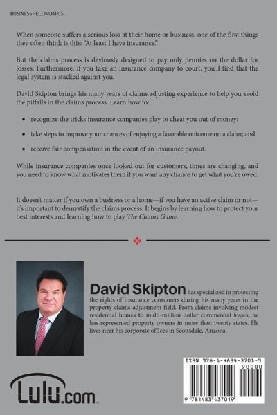 When someone suffers a serious loss at their home or business, one of the first things they often think is this: "At least I have insurance." But the claims process is deviously designed to pay only pennies on the dollar for losses. Furthermore, if you take an insurance company to court, you'll find that the legal system is stacked against you. David Skipton brings his many years of claims adjusting experience to help you avoid the pitfalls in the claims process. Learn how to: recognize the tricks insurance companies play to cheat you out of money; take steps to improve your chances of enjoying a favorable outcome on a claim; and receive fair compensation in the event of an insurance payout. It doesn't matter if you own a business or a home-if you have an active claim or not-it's important to demystify the claims process. It begins by learning how to protect your best interests and learning how to play The Claims Game.