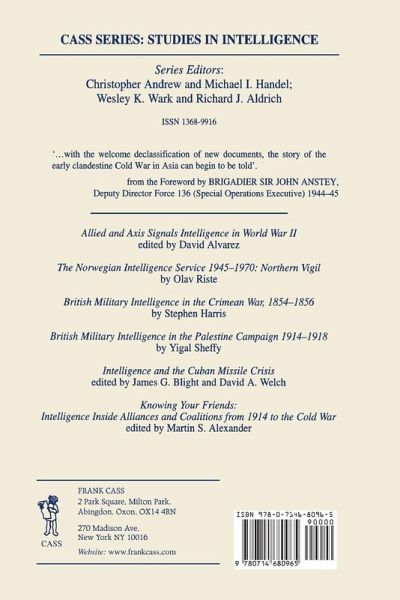 Asia represented the "hottest" theatre of the Cold War, with several declared and undeclared wars always in progress. Examining the Asian dimension of this struggle, this volume describes and analyzes a range of clandestine activities from intelligence and propaganda to special operations and security support. It draws on documents declassified after the end of the Cold War.