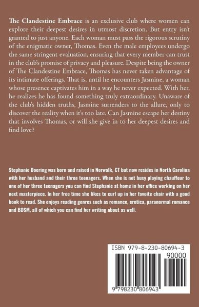 The Clandestine Embrace is an exclusive club where women can explore their deepest desires in utmost discretion. But entry isn't granted to just anyone. Each woman must pass the rigorous scrutiny of the enigmatic owner, Thomas. Even the male employees undergo the same stringent evaluation, ensuring that every member can trust in the club's promise of privacy and pleasure. Despite being the owner of The Clandestine Embrace, Thomas has never taken advantage of its intimate offerings. That is, until he encounters Jasmine, a woman whose presence captivates him in a way he never expected. With her, he realizes he has found something truly extraordinary. Unaware of the club's hidden truths, Jasmine surrenders to the allure, only to discover the reality when it's too late. Can Jasmine escape her destiny that involves Thomas, or will she give in to her deepest desires and find love?