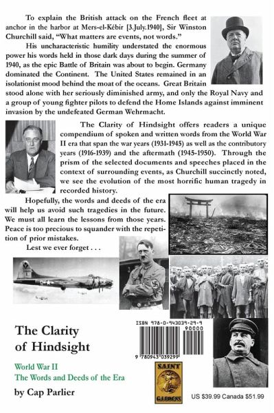 To explain the British attack on the French fleet at anchor in the harbor at Mers-el-Kébir [3.July.1940], Sir Winston Churchill said, "What matters are events, not words." His uncharacteristic humility vastly understates the enormous power his words held in those dark days during the summer of 1940. Through the prism of the selected documents and speeches, placed in the context of surrounding events, as Churchill succinctly noted, we see the evolution of the most horrific human tragedy in recorded history. The Clarity of Hindsight offers readers a unique compendium of spoken and written words from the World War II era that span the war years (1931-1945) as well as the contributory years (1916-1939) and the aftermath (1945-1950). Through the prism of the selected documents and speeches placed in the context of surrounding events, we see the evolution of the most horrific human tragedy in recorded history. There are well-known, historic words from famous leaders as well as obscure documents only recently declassified and publicly released. Through these words, we see more clearly why the events of the mid-20th century played out as they did and millions of people paid a grotesque and staggering price. The magnanimity of victors after the century's second, great, global confrontation contrast dramatically with the retribution imposed after the first Great War. Hopefully, the words and deeds of the era will help us avoid such tragedies in the future. We must all learn the lessons from those years. Peace is too precious to squander with the repetition of prior mistakes. Lest we ever forget . . .