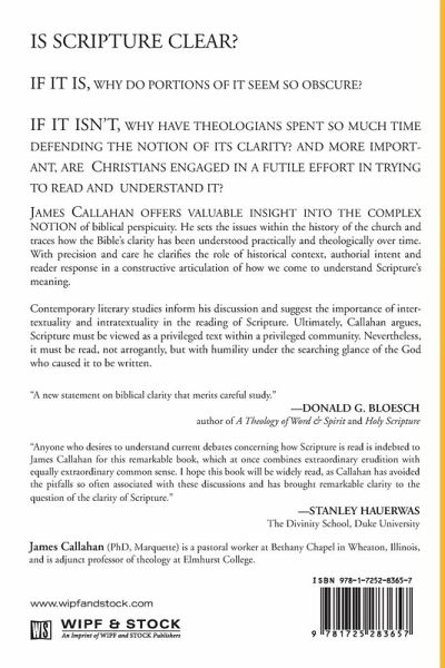 IS SCRIPTURE CLEAR? IF IT IS, WHY DO PORTIONS OF IT SEEM SO OBSCURE? IF IT ISN'T, WHY HAVE THEOLOGIANS SPENT SO MUCH TIME DEFENDING THE NOTION OF ITS CLARITY? AND MORE IMPORTANT, ARE CHRISTIANS ENGAGED IN A FUTILE EFFORT IN TRYING TO READ AND UNDERSTAND IT? JAMES CALLAHAN OFFERS VALUABLE INSIGHT INTO THE COMPLEX NOTION of biblical perspicuity. He sets the issues within the history of the church and traces how the Bible's clarity has been understood practically and theologically over time. With precision and care he clarifies the role of historical context, authorial intent and reader response in a constructive articulation of how we come to understand Scripture's meaning. Contemporary literary studies inform his discussion and suggest the importance of intertextuality and intratextuality in the reading of Scripture. Ultimately, Callahan argues, Scripture must be viewed as a privileged text within a privileged community. Nevertheless, it must be read, not arrogantly, but with humility under the searching glance of the God who caused it to be written.