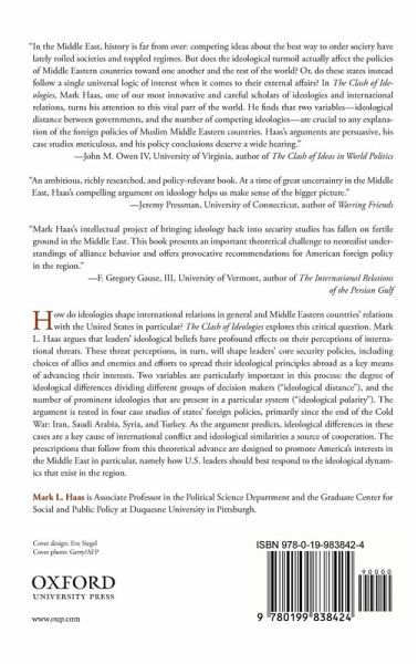 How do ideologies shape international relations in general and Middle Eastern countries' relations with the United States in particular? The Clash of Ideologies by Mark L. Haas explores this critical question. Haas argues that leaders' ideological beliefs are likely to have profound effects on these individuals' perceptions of international threats. These threat perceptions, in turn, shape leaders' core security policies, including choices of allies and enemies and efforts to spread their ideological principles abroad as a key means of advancing their interests. Two variables are particularly important in this process: the degree of ideological differences dividing different groups of decision makers ( "ideological distance "), and the number of prominent ideologies that are present in a particular system ( "ideological polarity "). The argument is tested in four case studies of states' foreign policies, primarily since the end of the Cold War: Iran, Saudi Arabia, Syria, and Turkey. As the argument predicts, ideological differences in these cases were a key cause of international conflict and ideological similarities a source of cooperation. Moreover, different ideological groups in the same country at the same time often possessed very different understandings of their threat environments, and thus very different foreign policy preferences. These are findings that other prominent international relations theories, particularly realism, cannot explain. Clash of Ideologies goes beyond advancing theoretical debates in the international relations literature. It also aims to provide policy guidance on key international security issues. These prescriptions are designed to advance America's interests in the Middle East in particular, namely how U.S. leaders should best respond to the ideological dynamics that exist in the region.