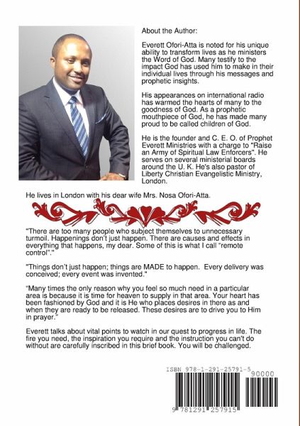 "There are too many people who subject themselves to unnecessary turmoil. Happenings don't just happen. There are causes and effects in everything that happens. Some of this is what I call "remote control"." "Things don't just happen; things are MADE to happen. Every delivery was conceived; every event was invented." Everett talks about vital points to watch in our quest to progress in life. The fire you need, the inspiration you require and the instruction you can't do without are carefully inscribed in this brief book. You will be challenged. Everett Ofori-Atta is noted for his unique ability to transform lives as he ministers the Word of God. His appearances on international radio has warmed the hearts of many to the goodness of God. He is the founder and President of Prophetic City Revival Ministries which has been involved in revival and crusades across Europe and Africa since 2013. He lives in London with his dear wife Nosa Ofori-Atta.