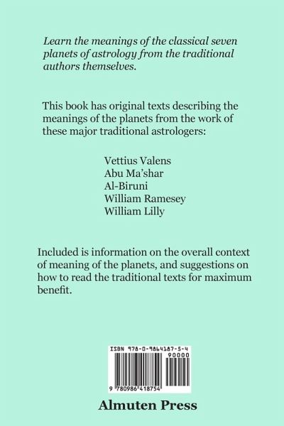 This book has the meanings of the classical seven planets of traditional astrology as described in the work of five major authors from astrology's tradition: Vettius Valens, Abu Ma'shar, Al-Biruni, William Ramesey and William Lilly. There is also information on the overall context of meaning of the planets, and suggestions to get the most out of the traditional texts.