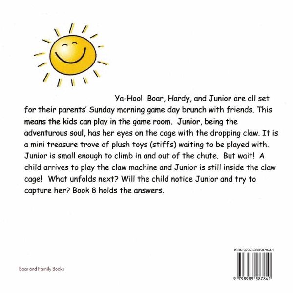 Ya-Hoo! Boar, Hardy, and Junior are all set for their parents' Sunday morning game day brunch with friends. This means the kids can play in the game room. Junior, being the adventurous soul, has her eyes on the cage with the dropping claw. It is a mini treasure trove of plush toys (stiffs) waiting to be played with. Junior is small enough to climb in and out of the chute. But wait! A child arrives to play the claw machine and Junior is still inside the claw cage! What unfolds next? Will the child notice Junior and try to capture her? Book 8 holds the answers.