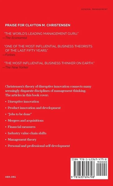 The best of Clayton Christensen's seminal work on disruptive innovation, all in one place. No business can afford to ignore the theory of disruptive innovation. But the nuances of Clayton Christensen's foundational thinking on the subject are often forgotten or misinterpreted. To achieve continuing growth in your business while defending against upstarts, you need to understand clearly what disruption is and how it works, and know how it applies to your industry and your company. In this collection of Christensen's most influential articles-carefully selected by Harvard Business Review's editors-his incisive arguments, clear theories, and readable stories give you the tools you need to understand disruption and what to do about it. The collection features Christensen's newest article looking back on 20 years of disruptive innovation: what it is, and what it isn't. Covering a broad spectrum of topics-business model innovation, mergers and acquisitions, value-chain shifts, financial incentives, product development-these articles illuminate the impact and implications of disruptive innovation as well as Christensen's broader thinking on management theory and its application in business and in life. This collection of best-selling articles includes: "Disruptive Technologies: Catching the Wave," by Joseph L. Bower and Clayton M. Christensen, "Meeting the Challenge of Disruptive Change," by Clayton M. Christensen and Michael Overdorf, "Marketing Malpractice: The Cause and the Cure," by Clayton M. Christensen, Scott Cook, and Taddy Hall, "Innovation Killers: How Financial Tools Destroy Your Capacity to Do New Things," by Clayton M. Christensen, Stephen P. Kaufman, and Willy C. Shih, "Reinventing Your Business Model," by Mark W. Johnson, Clayton M. Christensen, and Henning Kagermann, "The New M&A Playbook," by Clayton M. Christensen, Richard Alton, Curtis Rising, and Andrew Waldeck, "Skate to Where the Money Will Be," by Clayton M. Christensen, Michael E. Raynor, and Matthew Verlinden, "Surviving Disruption," by Maxwell Wessel and Clayton M. Christensen, "What Is Disruptive Innovation?" by Clayton M. Christensen, Michael E. Raynor, and Rory McDonald, "Why Hard-Nosed Executives Should Care About Management Theory," by Clayton M. Christensen and Michael E. Raynor, and "How Will You Measure Your Life?" by Clayton M. Christensen.
