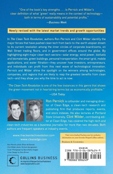 In The Clean Tech Revolution, authors Ron Pernick and Clint Wilder identify the major forces that have pushed clean tech from back-to-the-earth utopian dream to its current revolution among the inner circles of corporate boardrooms, on Wall Street trading floors, and in government offices around the globe. By highlighting eight major clean-tech sectors-solar energy, wind power, biofuels and biomaterials, green buildings, personal transportation, the smart grid, mobile applications, and water filtration-they uncover how investors, entrepreneurs, and individuals can profit from this next wave of technological innovation. Pernick and Wilder shine the spotlight on the winners among technologies, companies, and regions that are likely to reap the greatest benefits from clean tech-and they show you why the time to act is now.