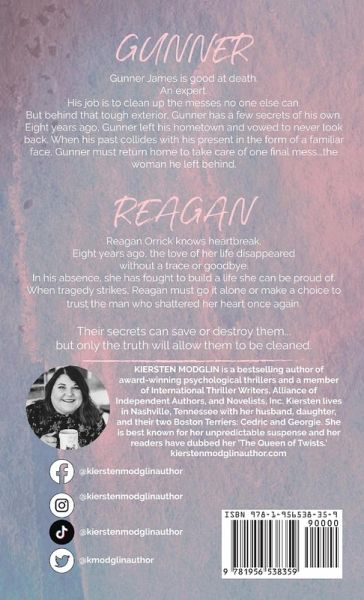 Gunner James is good at death. An expert. His job is to clean up the messes no one else can. But behind that tough exterior, Gunner has a few secrets of his own. Eight years ago, Gunner left his hometown and vowed to never look back. When his past collides with his present in the form of a familiar face, Gunner must return home to take care of one final mess...the woman he left behind. Reagan Orrick knows heartbreak. Eight years ago, the love of her life disappeared without a trace or goodbye. In his absence, she has fought to build a life she can be proud of. When tragedy strikes, Reagan must go it alone or make a choice to trust the man who shattered her heart once again. Their secrets can save or destroy them...but only the truth will allow them to be cleaned.