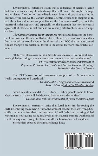Environmental extremists claim that a consensus of scientists agree that humans arc causing climate change that will cause catastrophic damage to the planet if we do not immediately enact laws and practices to stop it. But those who believe this cannot explain scientific reasons to support it. In fact, the science does not support it-not the "human-caused" part, not the catastrophic damage part, and especially not the assertion that most scientists agree with it. The claim that humans are causing catastrophic climate change is a hoax. The Climate Change Hoax Argument reveals and discusses the history of the hoax and the science that refutes it. Hundreds of renowned scientists from around the world dispute the claims of the IPCC that human-caused climate change is an existential threat to the world. Here are three such statements: "[C]urrent alarm over carbon dioxide is mistaken. . . Fears about man made global warming are unwarranted and are not based on good science." --Dr. Will Happer Professor at the Department of Physics at Princeton University and Former Director of Energy Research at the Dept. of Energy The IPCC's assertion of consensus in support of its AGW claim is "really outrageous and unethical." --Dr. Brilliant AL Briggs, climate statistician and Assoc. Editor of Monthly Weather Review "worst scientific scandal in ... history .... When people come to know what the truth is, they will feel deceived by science and scientists." --Dr. Kiminori Itoh, environmental physical chemist (Japan) Environmental extremists insist that fossil fuels are destroying the earth by emitting too much CO² into the atmosphere. But they are wrong. Scientific studies confirm that continued use of fossil fuels is not causing global warming; is not causing rising sea levels; is not causing extreme weather; and is not causing more droughts, floods, wildfires, hurricanes, or tornadoes. Science has exposed the climate change hoax.