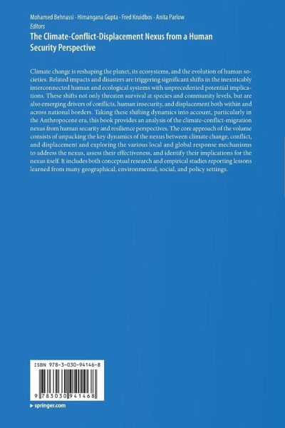 Climate change is reshaping the planet, its ecosystems, and the evolution of human societies. Related impacts and disasters are triggering significant shifts in the inextricably interconnected human and ecological systems with unprecedented potential implications. These shifts not only threaten survival at species and community levels, but are also emerging drivers of conflicts, human insecurity, and displacement both within and across national borders. Taking these shifting dynamics into account, particularly in the Anthropocene era, this book provides an analysis of the climate-conflict-migration nexus from human security and resilience perspectives. The core approach of the volume consists of unpacking the key dynamics of the nexus between climate change, conflict, and displacement and exploring the various local and global response mechanisms to address the nexus, assess their effectiveness, and identify their implications for the nexus itself. It includes both conceptual researchand empirical studies reporting lessons learned from many geographical, environmental, social, and policy settings.