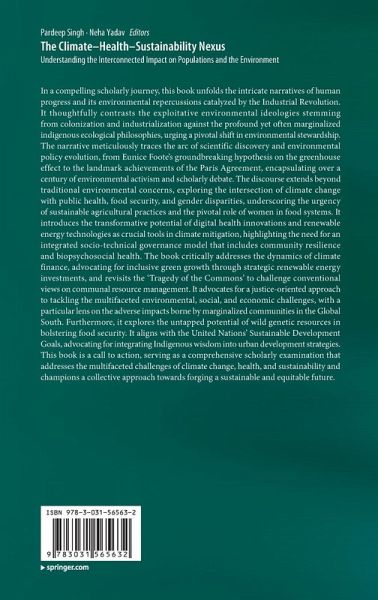 In a compelling scholarly journey, this book unfolds the intricate narratives of human progress and its environmental repercussions catalyzed by the Industrial Revolution. It thoughtfully contrasts the exploitative environmental ideologies stemming from colonization and industrialization against the profound yet often marginalized indigenous ecological philosophies, urging a pivotal shift in environmental stewardship. The narrative meticulously traces the arc of scientific discovery and environmental policy evolution, from Eunice Foote's groundbreaking hypothesis on the greenhouse effect to the landmark achievements of the Paris Agreement, encapsulating over a century of environmental activism and scholarly debate. The discourse extends beyond traditional environmental concerns, exploring the intersection of climate change with public health, food security, and gender disparities, underscoring the urgency of sustainable agricultural practices and the pivotal role of women in foodsystems. It introduces the transformative potential of digital health innovations and renewable energy technologies as crucial tools in climate mitigation, highlighting the need for an integrated socio-technical governance model that includes community resilience and biopsychosocial health. The book critically addresses the dynamics of climate finance, advocating for inclusive green growth through strategic renewable energy investments, and revisits the 'Tragedy of the Commons' to challenge conventional views on communal resource management. It advocates for a justice-oriented approach to tackling the multifaceted environmental, social, and economic challenges, with a particular lens on the adverse impacts borne by marginalized communities in the Global South. Furthermore, it explores the untapped potential of wild genetic resources in bolstering food security. It aligns with the United Nations' Sustainable Development Goals, advocating for integrating Indigenous wisdom into urban development strategies. This book is a call to action, serving as a comprehensive scholarly examination that addresses the multifaceted challenges of climate change, health, and sustainability and champions a collective approach towards forging a sustainable and equitable future.