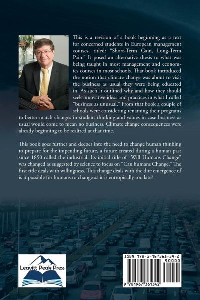 This is a revision of a book beginning as a text for concerned students in European management courses, titled: "Short-Term Gain, Long-Term Pain." It posed an alternative thesis to what was being taught in most management and economics courses in most schools. That book introduced the notion that climate change was about to visit the business as usual they were being educated in. As such it outlined why and how they should seek innovative ideas and practices in what I called "business as unusual." From that book a couple of schools were considering renaming their programs to better match changes in student thinking and values in case business as usual would come to mean no business. Climate change consequences were already beginning to be realized at that time. This book goes further and deeper into the need to change human thinking to prepare for the impending future, a future created during a human past since 1850 called the industrial. Its initial title of "Will Humans Change" was changed as suggested by science to focus on "Can humans Change." The first title deals with willingness. This change deals with the dire emergence of is it possible for humans to change as it is entropically too late?