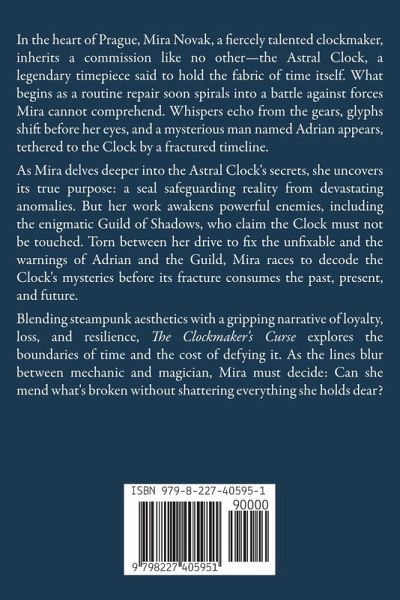 In the heart of Prague, Mira Novak, a fiercely talented clockmaker, inherits a commission like no other-the Astral Clock, a legendary timepiece said to hold the fabric of time itself. What begins as a routine repair soon spirals into a battle against forces Mira cannot comprehend. Whispers echo from the gears, glyphs shift before her eyes, and a mysterious man named Adrian appears, tethered to the Clock by a fractured timeline. As Mira delves deeper into the Astral Clock's secrets, she uncovers its true purpose: a seal safeguarding reality from devastating anomalies. But her work awakens powerful enemies, including the enigmatic Guild of Shadows, who claim the Clock must not be touched. Torn between her drive to fix the unfixable and the warnings of Adrian and the Guild, Mira races to decode the Clock's mysteries before its fracture consumes the past, present, and future. Blending steampunk aesthetics with a gripping narrative of loyalty, loss, and resilience, The Clockmaker's Curse explores the boundaries of time and the cost of defying it. As the lines blur between mechanic and magician, Mira must decide: Can she mend what's broken without shattering everything she holds dear?