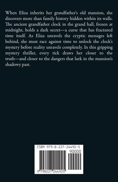 When Eliza inherits her grandfather's old mansion, she discovers more than family history hidden within its walls. The ancient grandfather clock in the grand hall, frozen at midnight, holds a dark secret-a curse that has fractured time itself. As Eliza unravels the cryptic messages left behind, she must race against time to unlock the clock's mystery before reality unravels completely. In this gripping mystery thriller, every tick draws her closer to the truth-and closer to the dangers that lurk in the mansion's shadowy past.