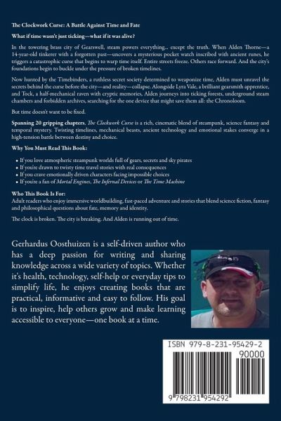 The Clockwork Curse: A Battle Against Time and Fate What if time wasn't just ticking-what if it was alive? In the towering brass city of Gearswell, steam powers everything... except the truth. When Alden Thorne-a 14-year-old tinkerer with a forgotten past-uncovers a mysterious pocket watch inscribed with ancient runes, he triggers a catastrophic curse that begins to warp time itself. Entire streets freeze. Others race forward. And the city's foundations begin to buckle under the pressure of broken timelines. Now hunted by the Timebinders, a ruthless secret society determined to weaponize time, Alden must unravel the secrets behind the curse before the city-and reality-collapse. Alongside Lyra Vale, a brilliant gearsmith apprentice, and Tock, a half-mechanical raven with cryptic memories, Alden journeys into ticking forests, underground steam chambers and forbidden archives, searching for the one device that might save them all: the Chronoloom. But time doesn't want to be fixed. Spanning 20 gripping chapters, The Clockwork Curse is a rich, cinematic blend of steampunk, science fantasy and temporal mystery. Twisting timelines, mechanical beasts, ancient technology and emotional stakes converge in a high-tension battle between destiny and choice. Why You Must Read This Book: * If you love atmospheric steampunk worlds full of gears, secrets and sky pirates * If you're drawn to twisty time travel stories with real consequences * If you crave emotionally driven characters facing impossible choices * If you're a fan of Mortal Engines, The Infernal Devices or The Time Machine Who This Book Is For: Adult readers who enjoy immersive worldbuilding, fast-paced adventure and stories that blend science fiction, fantasy and philosophical questions about fate, memory and identity. The clock is broken. The city is breaking. And Alden is running out of time.
