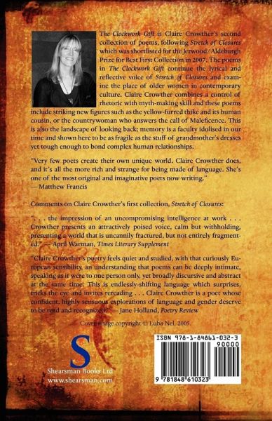 'The Clockwork Gift' is Claire Crowther's second collection of poems, following 'Stretch of Closures' which was shortlisted for the Jerwood/Aldeburgh Prize for Best First Collection in 2007. The poems in 'The Clockwork Gift' continue the lyrical and reflective voice of the previous volume and examine the place of older women in contemporary culture. Claire Crowther combines a control of rhetoric with myth-making skill and these poems include striking new figures such as the yellow-furred thike and its human cousin, or the countrywoman who answers the call of Maleficence. This is also the landscape of looking back; memory is a faculty idolised in our time and shown here to be as fragile as the stuff of grandmother's dresses yet tough enough to bond complex human relationships.