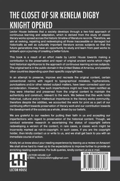 The Closet Of Sir Kenelm Digby Knight Opened: Newly Edited, With Introduction, Notes, And Glossary, By Anne Macdonell This book is a result of an effort made by us towards making a contribution to the preservation and repair of original classic literature. In an attempt to preserve, improve and recreate the original content, we have worked towards: 1. Type-setting & Reformatting: The complete work has been re-designed via professional layout, formatting and type-setting tools to re-create the same edition with rich typography, graphics, high quality images, and table elements, giving our readers the feel of holding a 'fresh and newly' reprinted and/or revised edition, as opposed to other scanned & printed (Optical Character Recognition - OCR) reproductions. 2. Correction of imperfections: As the work was re-created from the scratch, therefore, it was vetted to rectify certain conventional norms with regard to typographical mistakes, hyphenations, punctuations, blurred images, missing content/pages, and/or other related subject matters, upon our consideration. Every attempt was made to rectify the imperfections related to omitted constructs in the original edition via other references. However, a few of such imperfections which could not be rectified due to intentional\unintentional omission of content in the original edition, were inherited and preserved from the original work to maintain the authenticity and construct, relevant to the work. We believe that this work holds historical, cultural and/or intellectual importance in the literary works community, therefore despite the oddities, we accounted the work for print as a part of our continuing effort towards preservation of literary work and our contribution towards the development of the society as a whole, driven by our beliefs. We are grateful to our readers for putting their faith in us and accepting our imperfections with regard to preservation of the historical content. HAPPY READING!