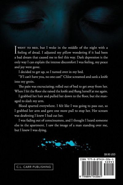 I went to bed, but I woke up in the middle of the night with a feeling of dread. I adjusted my pillow wondering if it had been a bad dream. Dark depression is the only way I can explain the intense discomfort I was feeling. My peace and joy were gone. I decided to get up, so I turned over in my bed. "If I can't have you, no one can!" Chloe screamed and sank a knife into my groin. The pain was excruciating; I rolled out of bed to get away from her. When I hit the floor she raised the knife and flung herself at me again. I grabbed her hair and pulled her down to the floor, but she managed to slash my arm. Blood spurted everywhere. I felt like I was going to pass out, so I grabbed her arm and pulled one more time. Her scream was deafening; I knew I had cut her. I was fading out of consciousness, and I thought I heard someone else in the apartment. I saw a man standing over me, but I knew I was dying.