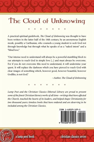 A practical spiritual guidebook, The Cloud of Unknowing was thought to have been written in the latter half of the 14th century, by an anonymous English monk, possibly a Carthusian, who counsels a young student to seek God not through knowledge but through what he speaks of as a "naked intent" and a "blind love." "Our intense need to understand will always be a powerful stumbling block to our attempts to reach God in simple love [...] and must always be overcome. For if you do not overcome this need to understand, it will undermine your quest. It will replace the darkness which you have pierced to reach God with clear images of something which, however good, however beautiful, however Godlike, is not God."--Author, The Cloud of Unknowing. Lamp Post is proud to present some of the finest Christian literary works of all time-writings that have affected the Church, touched the hearts of its leaders, and helped shape Christianity for two thousand years; timeless books that have endured and are deserving to be included among the Christian Classics.