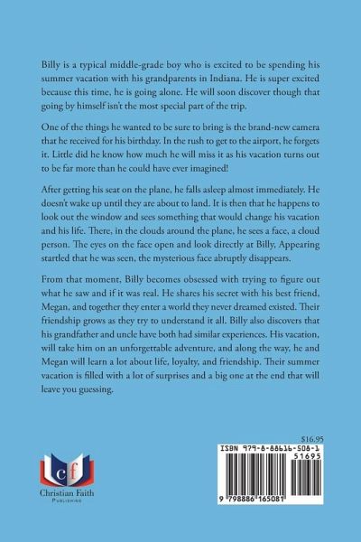 Billy is a typical middle-grade boy who is excited to be spending his summer vacation with his grandparents in Indiana. He is super excited because this time, he is going alone. He will soon discover though that going by himself isn't the most special part of the trip. One of the things he wanted to be sure to bring is the brand-new camera that he received for his birthday. In the rush to get to the airport, he forgets it. Little did he know how much he will miss it as his vacation turns out to be far more than he could have ever imagined! After getting his seat on the plane, he falls asleep almost immediately. He doesn't wake up until they are about to land. It is then that he happens to look out the window and sees something that would change his vacation and his life. There, in the clouds around the plane, he sees a face, a cloud person. The eyes on the face open and look directly at Billy, Appearing startled that he was seen, the mysterious face abruptly disappears. From that moment, Billy becomes obsessed with trying to figure out what he saw and if it was real. He shares his secret with his best friend, Megan, and together they enter a world they never dreamed existed. Their friendship grows as they try to understand it all. Billy also discovers that his grandfather and uncle have both had similar experiences. His vacation, will take him on an unforgettable adventure, and along the way, he and Megan will learn a lot about life, loyalty, and friendship. Their summer vacation is filled with a lot of surprises and a big one at the end that will leave you guessing.
