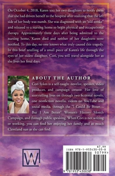 As a middle aged, single, black woman, Karen Todd is content with living life simply. She goes to work, keeps in touch with her family, and loves her God. But one day, on her day off, she wakes up and finds that she is having trouble moving her left hand. Thinking she needs to sleep it off, she takes a nap. When she wakes back up, she fixes a bowl of oatmeal and the bowl slips right out of her hand. Not knowing what else to do, she calls the nursing hotline and they advise her that she needs to go to the emergency room right away; she could be having a stroke. Karen immediately gets in her car and drives to the hospital. While there, she loses feeling on her left side and is admitted for further testing. Results determine that she suffered from an "old stroke." With the cause determined, she is released to a nursing home to be rehabilitated through occupational and physical therapy. She is only there for three days before she loses consciousness and dies. Neither of her two daughters are notified until the next morning. What happened to Karen Todd? Although the cause remains unknown, in this brief retelling of a small piece of Karen's life through the eyes of her oldest daughter, Cori, you will travel alongside her as Karen lives her final days. A Note From Cori If you've lost a loved one while they were in the care of a hospital or nursing home, this story may trigger painful memories or thoughts. If you find that you are unable to continue reading The Clouds Will Catch Me at any point, please put the book down. Believe me, there were many times while writing this that I had to put the book down. Therapy has helped but there are still days when I figuratively put down my book, and that's okay.