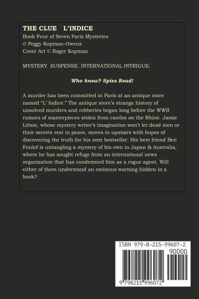 Cover Art © Roger Kopman. Who knew? Spies Read! A murder has been committed in Paris at an antique store named "L' Indice." The antique store's strange history of unsolved murders and robberies began long before the WWII rumors of masterpieces stolen from castles on the Rhine. Jamie Litton, whose mystery writer's imagination won't let dead men or their secrets rest in peace, moves in upstairs with hopes of discovering the truth for his next bestseller. His best friend Ben Foulof is untangling a mystery of his own in Japan & Australia, where he has sought refuge from an international news organization that has condemned him as a rogue agent. Will either of them understand an ominous warning hidden in a book?