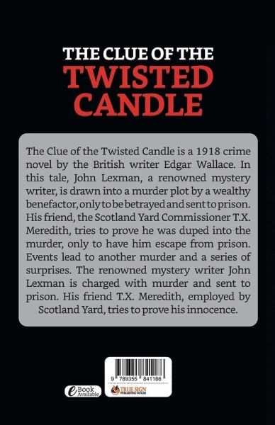The Clue of the Twisted Candle is a 1918 crime novel by the British writer Edgar Wallace. In this tale, John Lexman, a renowned mystery writer, is drawn into a murder plot by a wealthy benefactor, only to be betrayed and sent to prison. His friend, the Scotland Yard Commissioner T.X. Meredith, tries to prove he was duped into the murder, only to have him escape from prison. Events lead to another murder and a series of surprises. The renowned mystery writer John Lexman is charged with murder and sent to prison. His friend T.X. Meredith, employed by Scotland Yard, tries to prove his innocence.