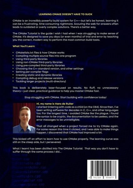 Shortcut Your Path to Building C++ Code like a Pro Programmers know that horrible feeling. You're trying to achieve something that should be simple, and simply cannot figure out how to do it. Hours turn into days, and then finally you find the solution. And yes, that solution was simple. Big sigh of relief! That was me with CMake. Time and time again. CMake is a powerful build tool for C/C++, but can be an absolute pain to use. Scouring the internet for hours each time you need to modify your CMakelists.txt file is hard work. Even worse, you often end up learning the "wrong" (old) way of doing things. There are plenty of old and downright bad CMake tutorials and examples out there... It'll Save You Days (and possibly Months) I've taken everything I learnt, and distilled it down to the essentials. The "Learn Modern CMake by Example" book/course will save you days (and possibly months) of time and frustration, by teaching you the correct (modern) ways to perform the most common build tasks. It's the book/course that I wish I had when I was learning how to use CMake. Deliberately Short & Focused on Results The CMake Tutorial is deliberately short, and focused sharply on making CMake do what you need it to. It doesn't cover every nook and cranny (of CMake), nor does it bog you down with endless theory and backstory. Your time is valuable, so it's designed to get you up and running quickly. No drowning you with details on every single CMake feature (that's what the official documentation is for). It's got only the bits you're most likely to need, which have been organized for fast learning. Learn Without Breaking the Bank A CMake course could set you back $1350 USD. Yes, it's a valuable skill. The CMake Tutorial won't cost you anywhere near as much. Not even half! I know you won't be making the big bucks at the start of your career, and I also know what it's like to be scratching out a living. So, The CMake Tutorial has been priced so it's affordable to those who are getting started. What You'll Learn in The CMake Tutorial - CMakelists.txt files & how CMake works - Compiling multiple source files into one program - Using third-party libraries - Using non-CMake third-party libraries - Using pre-compiled third-party libraries - Choosing the C++ standard version, and other settings - Setting per-compiler flags - Creating static and dynamic libraries - Compiling debug and release versions - Tackling larger projects (multi-directory)