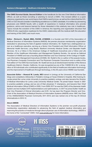 The CMIO Survival Guide is the handbook for the new Chief Medical Information Officer, as well as for those recruiting or planning to recruit a CMIO. This quick reference is organized by real-world topics that CMIOs need to know, as well as the criteria that the CIO, CMO or CEO should consider in identifying excellence in a CMIO candidate. It is written by pioneering physicians and AMDIS faculty with a wealth of experience in medical informatics who provide guidance, advice and lessons learned for those interested in this relatively new role in healthcare. This second edition updates every chapter in the original work and adds new chapters to address the changes in healthcare delivery, the role of the physician executive, technology, medical education, small and rural hospitals.