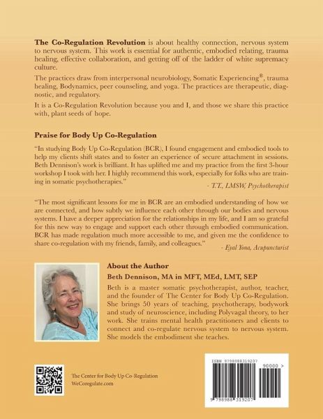 The Co-Regulation Revolution, from master somatic psychotherapist and author Beth Dennison, is both co-regulation theory and applied psychology (simple practices to use right away). It is the latest work in her life-long study of shame, healthy relationships, embodiment, and clinical trauma work. In therapy and in life, we can rewire our nervous systems for mutual regulation (co-regulation). This is essential for authentic, embodied relating, healing PTSD, effective collaboration, and building our capacity for social justice. With The Co-Regulation Revolution and Body Up Co-Regulation, Beth gives practitioners clear maps and concrete tools to: ¿ Heal from shame and developmental trauma with safe, appropriate, embodied connection. ¿ Build greater capacity for co-regulation and resilience at the nervous system level. ¿ Replace compulsive competition for status on the ladder of white supremacy culture with healthy, peer relationships. ¿ Prevent burnout - because co-regulation is only co-regulation when it is good for both people. Body Up Co-Regulation (BCR) draws from interpersonal neurobiology, Somatic Experiencing, trauma healing, Bodynamics, peer counseling, and yoga. The practices are therapeutic, diagnostic, and regulatory. What could be a better therapeutic outcome than teaching clients to have relationships that nourish both people? How much more will you thrive in your practice when your client relationships are good for you, too? Interpersonal neurobiology and polyvagal theory have brought profound insights into psychology and psychotherapy regarding how essential our relationships are, including our own somatic body/mind relationship. As therapists, social workers, leaders, and teachers - we are positioned to help people build healthy, collaborative relationships that support social justice work and help heal attachment issues and complex PTSD. Clinical practitioners who train in Body Up Co-regulation find the work to be: "simple and powerful," "brilliant and uplifting," "invaluable for authentic communication," "safe and non-judgmental," and "incredibly helpful in a variety of real-life situations." Reading this book can orient you to a whole new way of relating and doing therapy. Practicing the exercises will change your patterns of relating. Training in BCR is a deep dive into the subtle and potent world of working nervous system to nervous system. In BCR practice, one person leads, and one mirrors, in a simple 1-2-minute exercise. They speak about their experience and then switch roles. This cultivates our capacity for peer relating and embodiment in relational space. It sounds simple, yet the layers of somatic learning and mutual regulation pave the way for a Co-Regulation Revolution - a cumulative, profound change in how we live and relate, together.